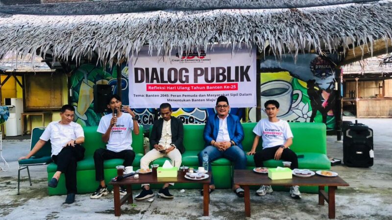 Creative Democracy Center (CDC) Forum Mahasiswa dan Pemuda menggelar Dialog Publik bertajuk *“Refleksi Banten 2045: Peran Pemuda dan Masyarakat Sipil dalam Menentukan Banten Maju”* untuk memperingati HUT Provinsi Banten ke-25. Acara ini menghadirkan narasumber dari kalangan akademisi, tokoh pemuda, dan Ketua KNPI Provinsi Banten. Dengan demikian, diskusi ini menjadi wadah strategis untuk membedah arah pembangunan Banten melalui lensa demokrasi partisipatif.