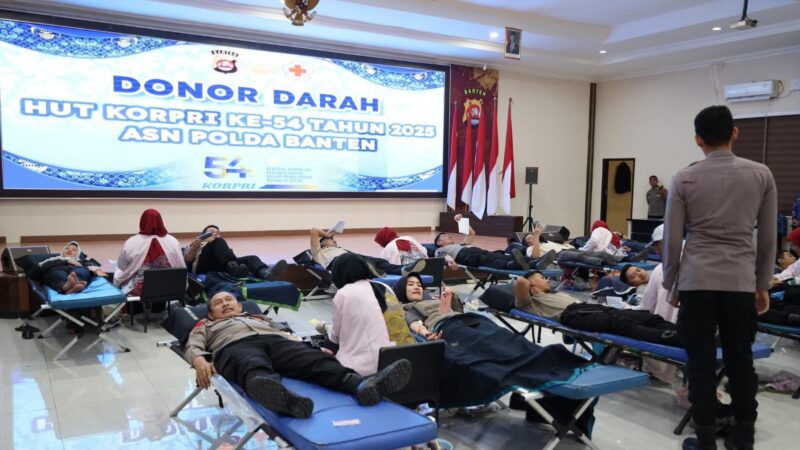 Serang, Nusantara Media – Dalam rangka memperingati Hari Ulang Tahun Ke-54 Korps Pegawai Republik Indonesia (Korpri), ASN Polda Banten menggelar aksi donor darah bertema “Bersatu, Berdaulat, Bersama KORPRI dalam Mewujudkan Indonesia Maju”.
