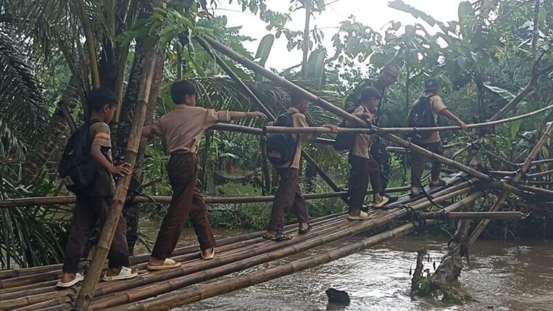 Kapten Inf Purgiarto, Danramil 0116/Cikeusik Kodim 0601/Pandeglang, bertindak cepat. Ia membantu siswa SD Negeri Cikadongdong 2 melintasi jembatan darurat. Lokasi kejadian: Kampung Cipa’as, Desa Cikadongdong, Kecamatan Cikeusik, Kabupaten Pandeglang, Banten.