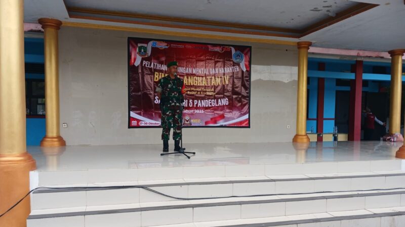 Kapten Inf Purgiarto, Danramil 0116/Cikeusik Kodim 0601/Pandeglang, membuka pelatihan bimbingan mental dan karakter untuk siswa kelas X SMK Negeri 5 Pandeglang. Acara berlangsung di halaman sekolah di Kecamatan Cikeusik, Kabupaten Pandeglang, pada 29 Oktober 2025.