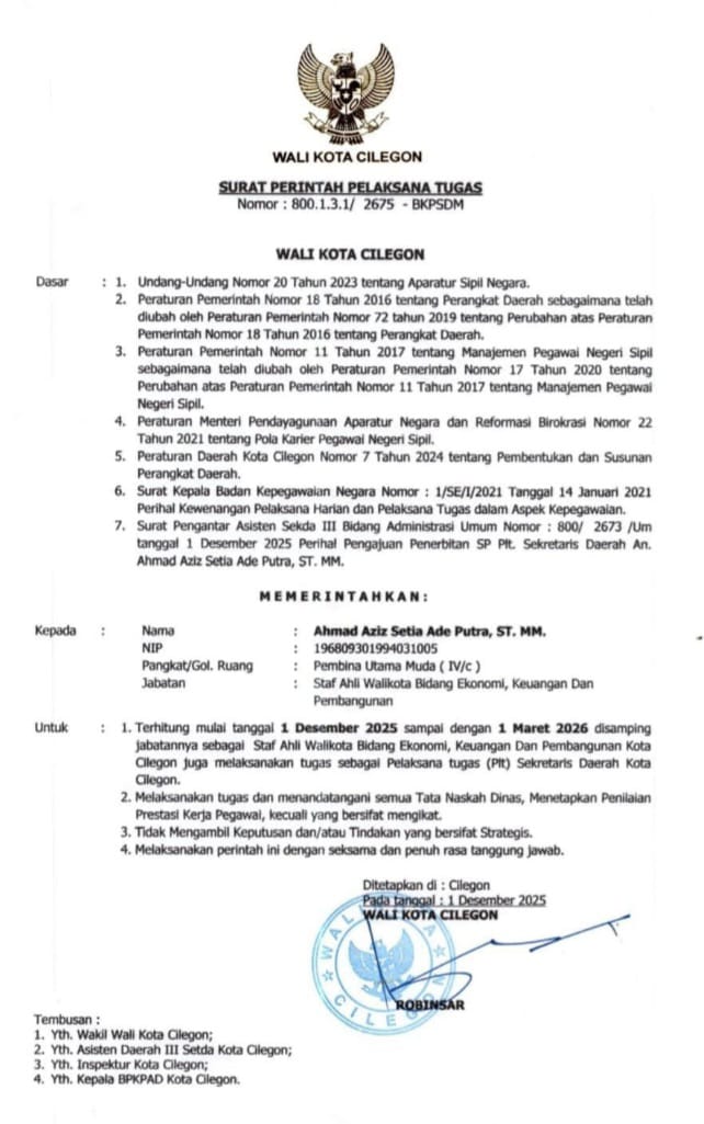 Wali Kota Robinsar menunjuk Ahmad Aziz Setia Ade Putra sebagai Pelaksana Tugas (Plt.) Sekda Kota Cilegon. Penunjukan ini berlaku mulai 1 Desember 2025 hingga 1 Maret 2026. Informasi menunjukkan, pemberhentian Maman—yang berpangkat Pembina Utama Madya (IV/d)—berdasarkan laporan hasil uji kompetensi jabatan pimpinan tinggi (JPT) pratama.