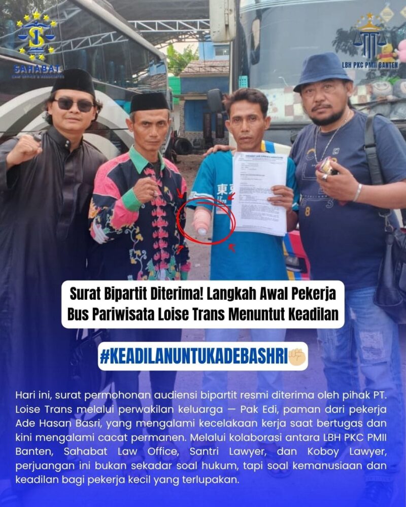Pihak PT. Loise Trans secara resmi menerima surat permohonan audiensi bipartit pada hari ini melalui perwakilan keluarga, Pak Edi, paman dari pekerja Ade Hasan Basri. Ade mengalami kecelakaan kerja saat bertugas, yang menyebabkan cacat permanen.