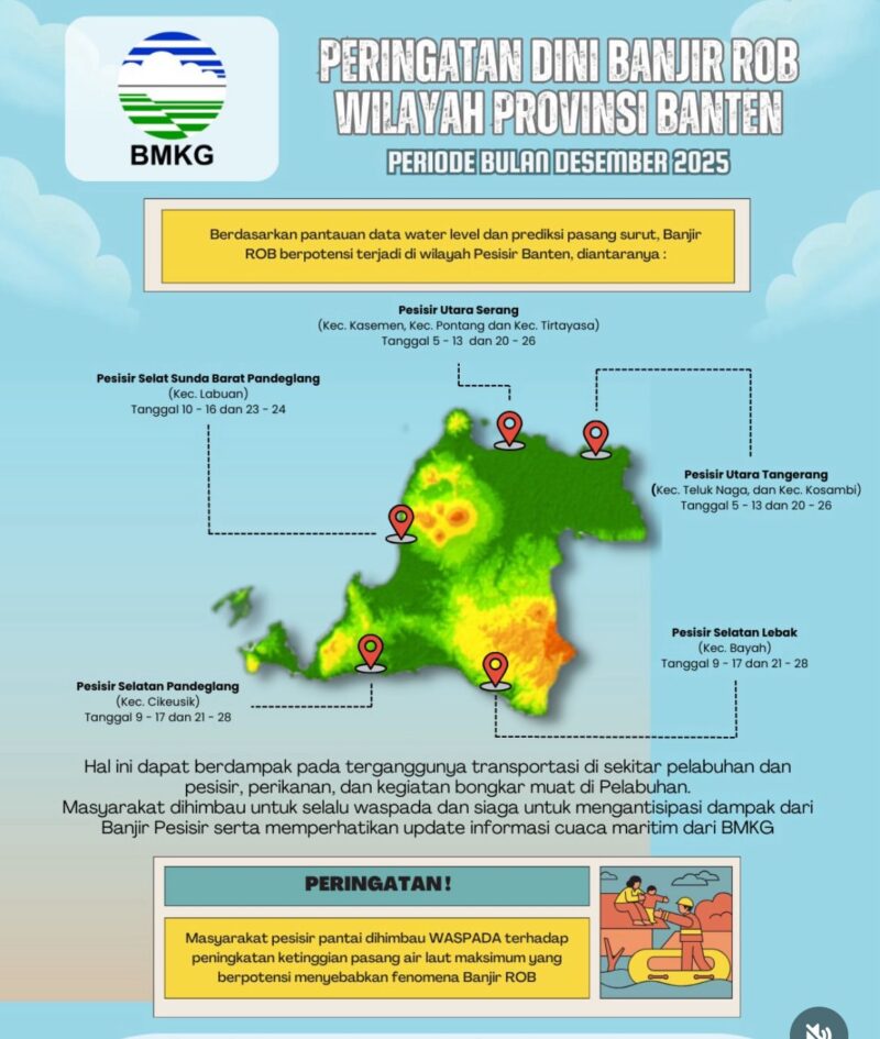 Selain itu, waspadai gelombang tinggi 1,25-2,50 meter. Lokasi rawan termasuk Selat Sunda Barat Pandeglang, Perairan Selatan Pandeglang, dan Perairan Selatan Lebak.